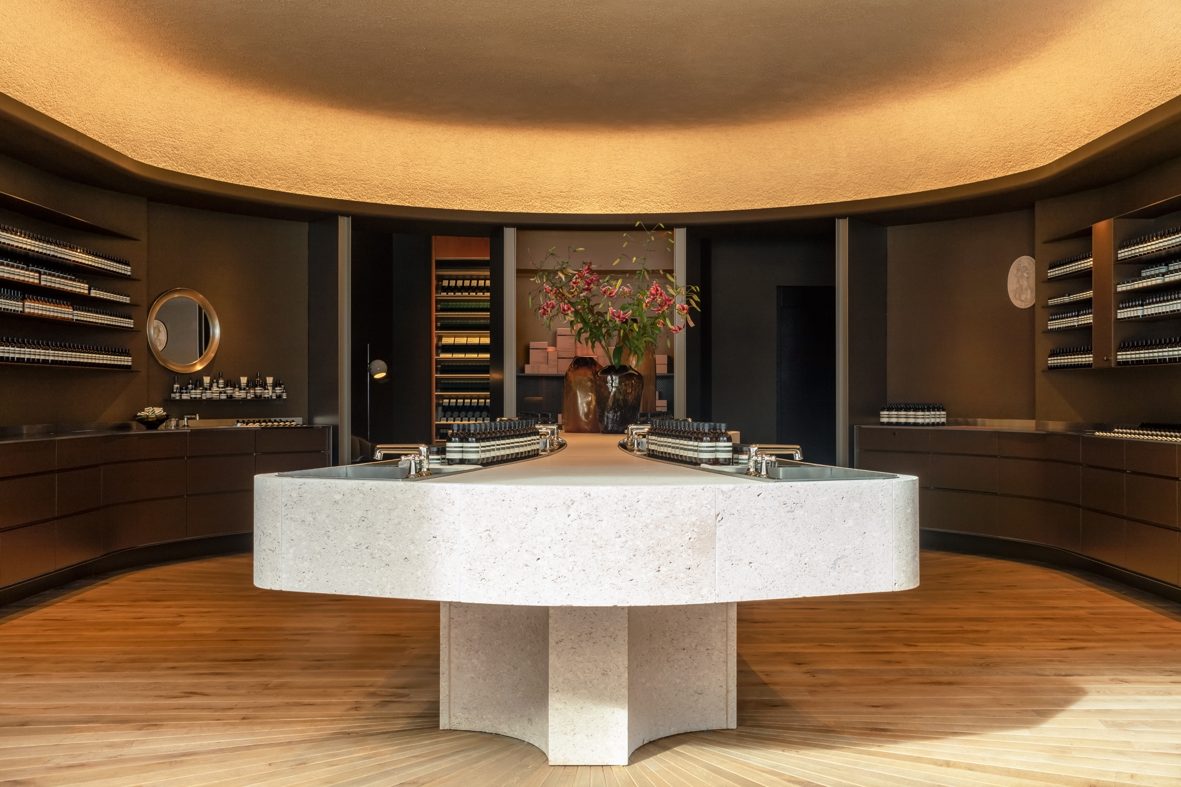From the main space, two portals lead visitors to experiential spaces. First, the Sensorium, an intimate space where a Fragrance Armoire awaits where customers can imbue an item of clothing with their chosen Eau de Parfum. The other, is a portal to a 300sqm underground treatment suite of enveloping atmosphere, devoted to Aesop’s facial appointments – a fitting refuge from the rushing city above.